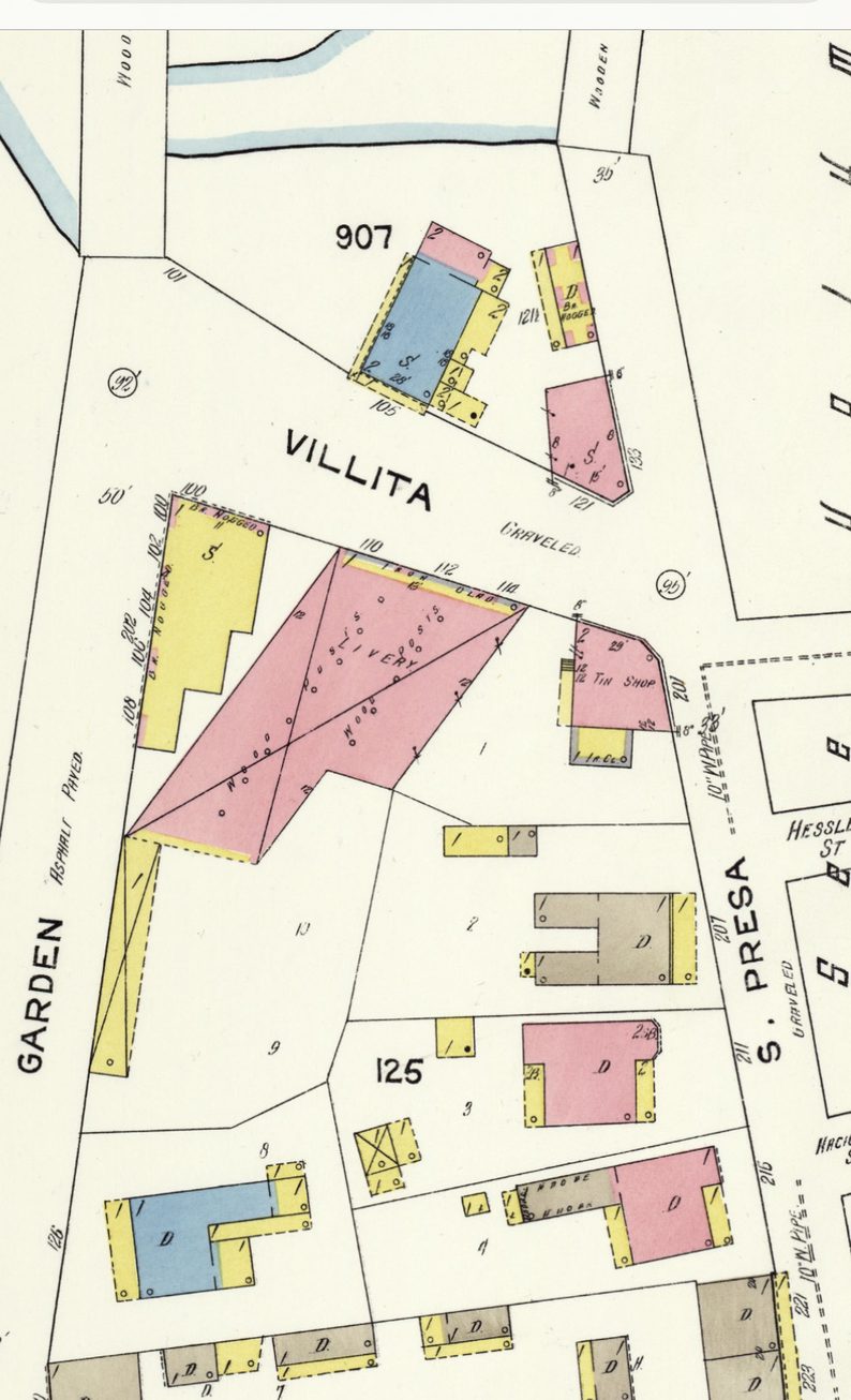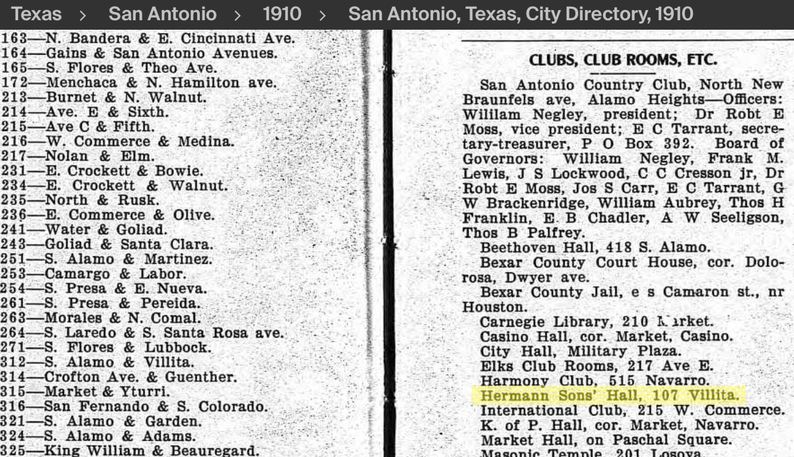 In the early 1900s Villita Street spanned from Alamo Street all the way to Presa Street. The original 100 block of Villita connected Garden and Presa Streets and was the whereabouts of a tin shop, a livery, one dwelling, and the first “Halle der Hermann Sohne.” Since then that little section of Villita Street has been usurped by new development, and the former Hermann Sons Hall is long gone. The former CPS Energy headquarters now stands in its place (built 1968) and a breezeway traces that bygone block of Villita.