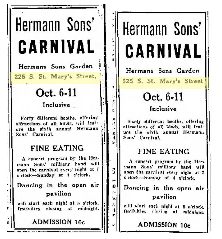 Finally on March 5, 1928 Garden Street was officially renamed to S. St. Mary’s Street following a vote by city council. Overnight the Hermann Sons address was changed from 225 Garden Street to 525 S. St. Mary’s Street. Naturally the change led to some confusion and was not immediately adopted. In fact, the October 1928 Hermann Sons Carnival event was advertised in the newspaper with two ads having two different addresses. It took Hermann Sons about half a year to settle into the new address, and we’ve had almost 95 years to get used to it.