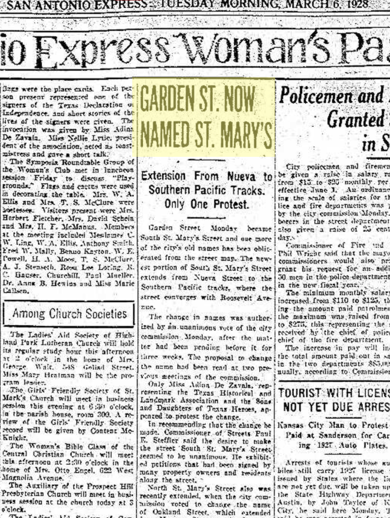The conversation about renaming Garden Street started in 1906 when city aldermen were hotly debating whether San Antonio would be “progressive enough” to follow the lead of other cities in the United States, such as New York, that were “systematizing the numbering of houses”. They were also deciding whether to continue using the river as the east-west dividing line, and whether to honor heroes by naming streets after them. At that time an ordinance was introduced to rename Garden Street to Navarro, then a few years later it was proposed that both should be renamed to Ursuline, but the matter of renaming Garden Street would not be settled for another 22 years.