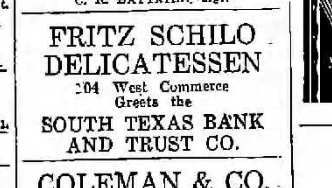 In 1932 several ads for Schilo’s Delicatessen were oddly combined with a greeting to a bank, hinting at a fascinating story of San Antonio’s most notable 1931 bank run at City-Central Bank. This was an anxious and difficult chapter of this city’s history; among the failed bank’s depositors was the City of San Antonio itself. Urgently, but not as rapidly as hoped, the South Texas Bank & Trust Company was formed to replace the closed bank. Throughout those intervening months the city’s eyes were on the new bank, and all hope depended on persuading citizens to trust this new bank to hold their money. At one high-profile luncheon at the Gunter Hotel, a funeral march was performed following a toast by Mr. Porter Loring (mortuary owner) as a “token” for the closing of the former bank, a surprisingly irreverent and amusing spectacle that was even broadcast live on WOAI radio. Fritz Schilo Sr was present of course, as he was a founder and the vice president of South Texas Bank & Trust.