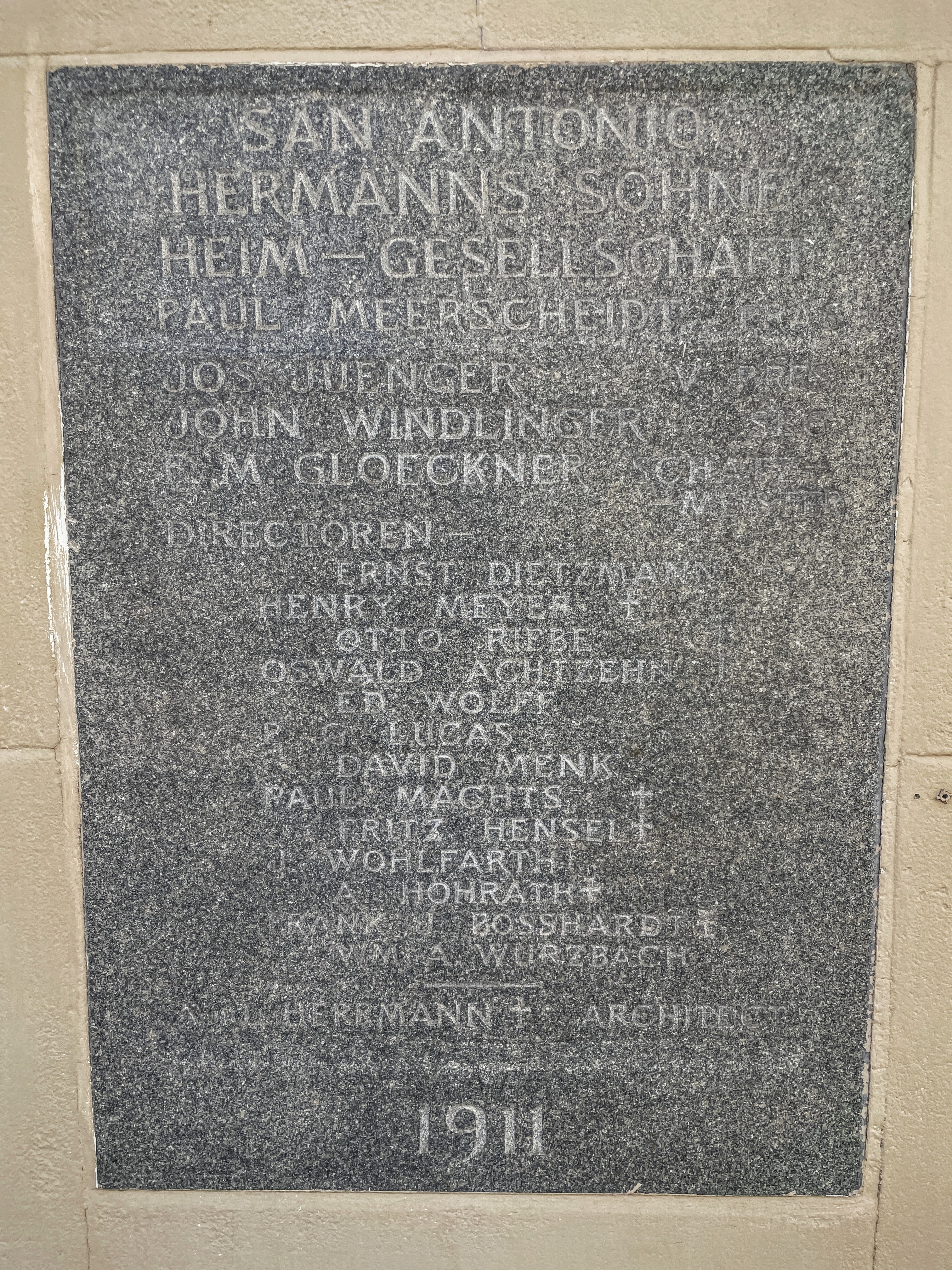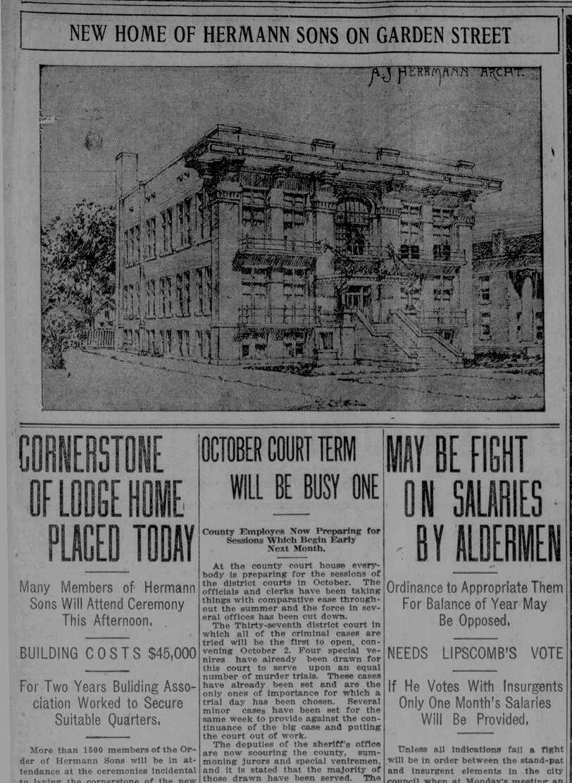 On September 10, 1911 a ceremony at the new Hermann Sons Home Association building drew a crowd of 1500 members who witnessed the cornerstone as it was laid in place. Within the cornerstone a copper box was placed containing a number of articles, including daily newspapers, souvenirs, emblems, and a document reviewing the history of the organization. President Paul Meerscheidt read aloud the history before placing it in the box.