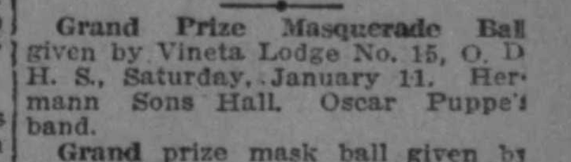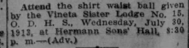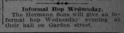 The first dance in Hermann Sons Hall was a Leap Year Ball given by the Vineta lodge on Saturday, May 11, 1912. Tickets were 25 cents.